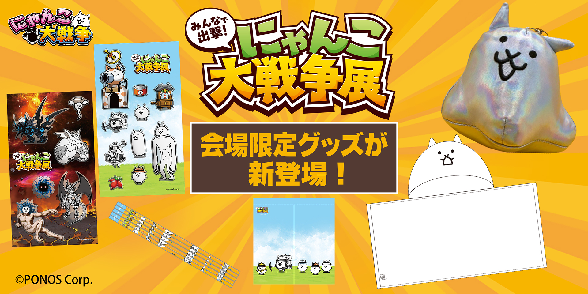 HOME お知らせ 『みんなで出撃!にゃんこ大戦争展』札幌会場にて、会場限定グッズが新登場! 『みんなで出撃!にゃんこ大戦争展』札幌会場にて、会場限定グッズが新登場! 「グッズ一覧」に札幌会場から追加発売となる新グッズ5点を公開しました。 グッズ一覧|みんなで出撃!にゃんこ大戦争展